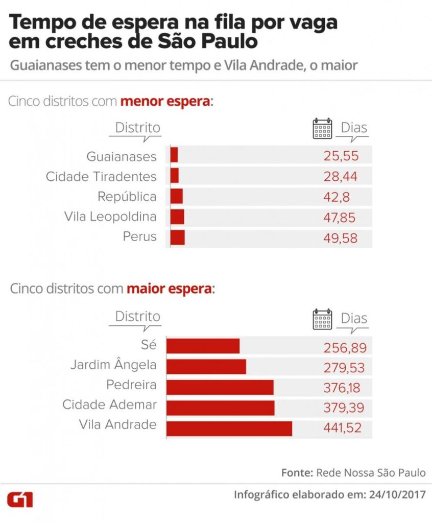 Uma criança que está na fila da vaga em creches no distrito de Guaianases, extremo da Zona Leste de São Paulo, espera, em média, 25,5 dias, enquanto as crianças com até 3 anos de idade que residem na Vila Andrade, região do Morumbi, na Zona Sul, aguardam 441,52 dias. A diferença entre a pior e a melhor é de 17,28 vezes.